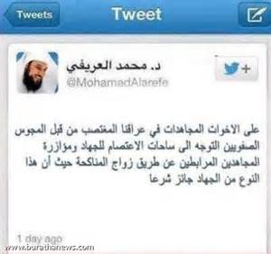 عایشه بکری ،دختر نوجوانی از عربستان سعودی است که 15 سال بیشتر ندارد ، وی بعد از سه ماه حضور در سوریه به عربستان بازگشت ! او که به جهاد نکاح (فتوایی از مفتی های وهابی!!!)رفته بود در فرودگاه رفیق حریری بیروت گفت : به این دلیل به سوریه رفتم چون فتوی شیخ العریفی را درباره لزوم جهاد نکاح که باعث تقرب به درگاه الاهی میشود را شنیدم ، و من بسیار به شیخ عریفی علاقه مندم !